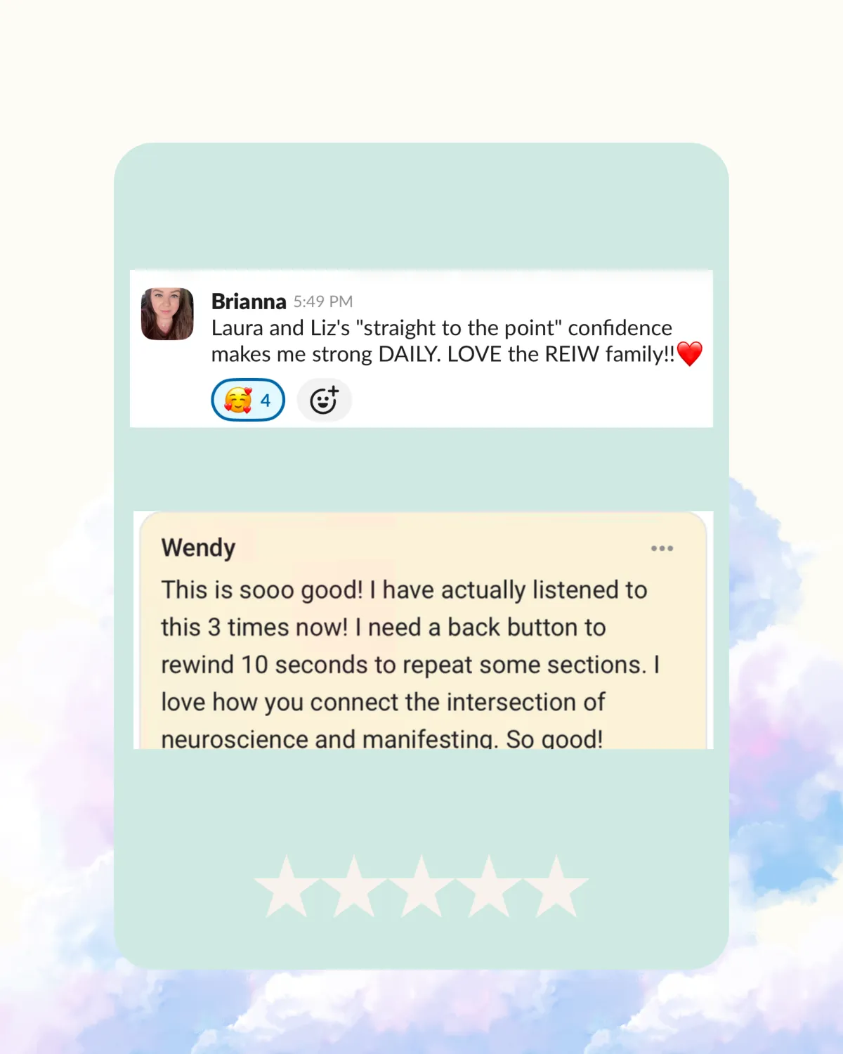 You’ll get access to daily affirmations, weekly live mindset calls, a private community forum, monthly book club picks, creative activities like vision boards, a monthly bucket list to add more fun and joy into your life, on-demand audio and video content, and an archive of past calls, workshops, and resources.